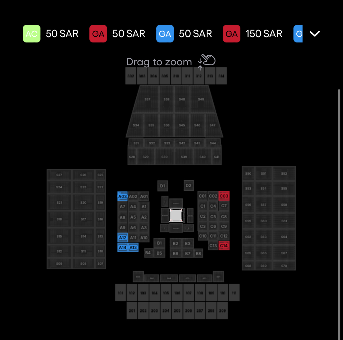 So sah die Lage heute Morgen aus. Alle Plätze im Innenraum gelten als VIP und da bist du dann ab 105-150 EUR dabei für “Gold”. Darüber gibts noch Platinum für 140-200 EUR und Diamond für 250 EUR. Alles darüber ist dann vermutlich auf Einladung. Das ist wie gesagt Innenraum und die VIP-Plätze auf den Seiten.Die restlichen Plätze kannst du als General Admission für 12,50/37,50/44 EUR (50/150/175 SAR) kaufen.