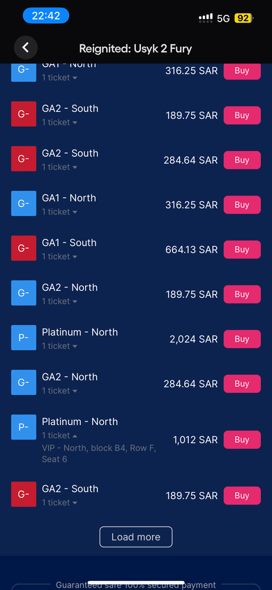 Dazu gibt’s noch den offiziellen WeBook-Resale. Nervig weil du nicht sortieren kannst und die Tickets zwischen wild über OP, OP und leicht unter OP variieren. Plätze sieht man auch nur wenn man links auf ein Angebot klickt.Witzig ist: Wenn man da jetzt drauf geht sind die Preise nur noch ab 150 EUR (600 SAR) aufwärts! Der Saudi fährt offenbar wenn dann sehr spontan zum Boxen.