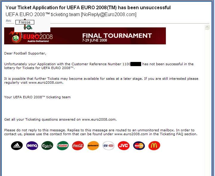 Hier noch eine Erfolgsmeldung über Warteliste. Ein Kollege ist der Glückliche. Die Zuteilung erfolgte am Montag (24.9.). Es handelt sich um ein Gruppenspiel in Insbruck. Der hatte nur 2 Karten bestellt. Er macht da immer Urlaub und hatte es einfach probiert.