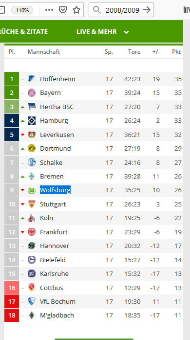 hab hePlatz 9 und 9 Punkte Rückstand auf den 3. der Tabelle.. Mal ein Blick in die Historie, Saison 2008/2009, Tabelle nach dem 17.Spieltag. Platz 9 mit 9 Punkten Rückstand auf den 1. ist mal markiert. Vielleicht erinnert sich der ein oder andere, wie die Tabelle nach 34.Spieltagen aussah.