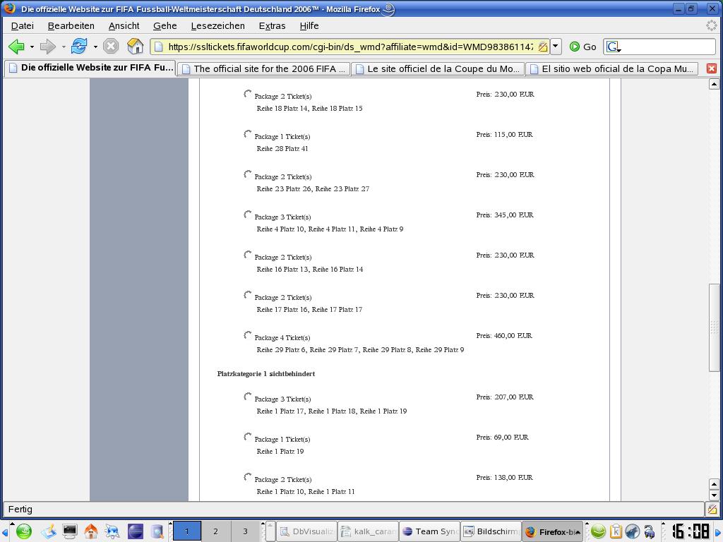 z.B. war beim Spiel #5 Argentinien-Elfenbeinküste immer wieder das selbe Package (4xKat. 4 Reihe 18, Sitz 2-5) drin, aber wenn man es auswählen wollte, dann ist immer der Fehlerlink gekommen udn immer, wenn mmich ResaleAlarm auf diese Spiel hingewiesen hat, hab ichs erbneut probiert, indem ich beiom Felerlink F5 gedrückt hab, aber es ist immer nur degestanden...