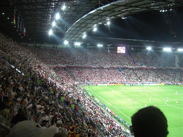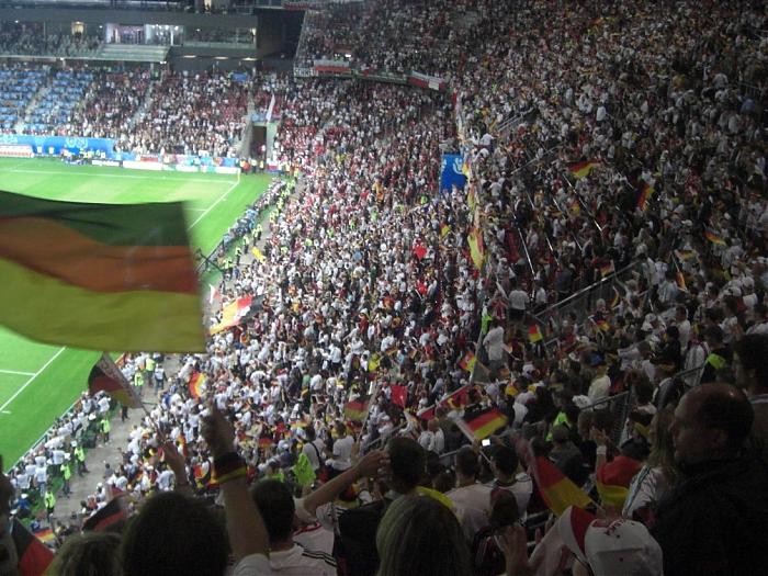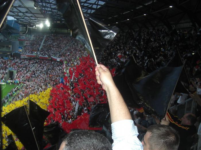Ansonsten eher Eventfans. Hinter uns Papa mit 2 Kids (Pooooldddiiiiiiii :mad:), vor und Geschäftsleute und vereinzelt eben so Verückte wie wir. Darunter litt die Stimmung zuerst deutlich. Wir waren im Umkreis von 5 Sitzreihen die Einzigen, die "SO GEHN DIE POLEN, DIE POLEN DIE GEHN SO..." mitgemacht haben, bis alle es kapiert hatten und dann amüsiert teilgenommen haben. Die meiste Stimmung ging von den Leuten direkt hinter dem Tor aus, da haben sie sauber Dampf gemacht (meine nicht die Bengalo in der 25. Minute). Ab dem Tor war dann allerdings super Stimmung im Block, und nahezu alle haben mitgemacht. Mitte erste Halbzeit haben Polen, die übrigens auch vereinzelt in den deutschen Blöcken sassen, ein großes Banner im ersten Rang im dt. Block an die Brüstung gehängt. Sofort ging es derbst zur Sache. 3-4 glaube Dresdner Ultras kamen sofort angestürmt und wollten es abhängen, wurden aber von den Stewards abgehalten. Dann haben Volunteers den Polen etwas zugeflüstert und nachdem der gesammte Unterrang "AUF DIE FRESSE !!!" skandierte, wurde es unter Beifall abgehängt. Nach dem Spiel sind wir sitzengeblieben und wurden nach 20 Minuten gebeten den Block zu verlassen. Mario Gomez (der meiner Meinung nach ein riesen Spiel gemacht hat-immer anspielbar-geackert wie ein Tier) kam ne halbe Stunde nach Spielschluss noch einmal raus und hat im dt. Block Bilder machen lassen und Autogramme gegeben. Schließlich mit einem der regelmäßig fahrenden Busse zurück und vor dem Wohnmobil weitergechillt....