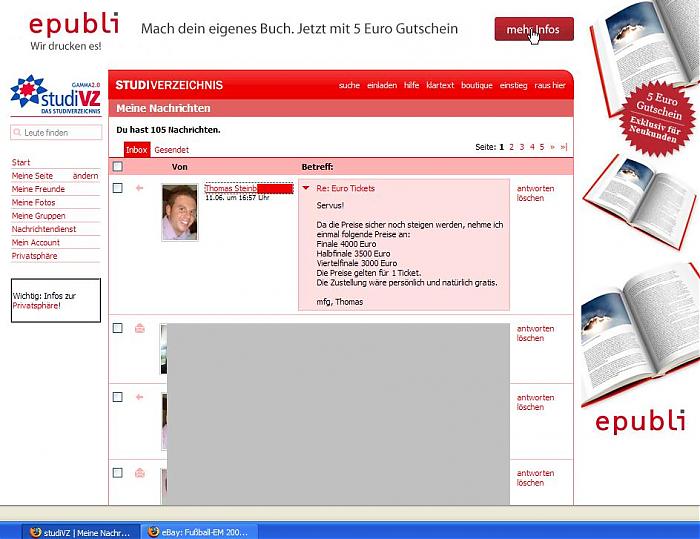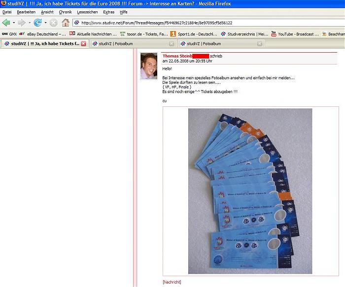 Bild 2: Sein Aufruf im StudiVZ Forum "!Ja ich habe EM Tickets!"