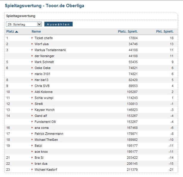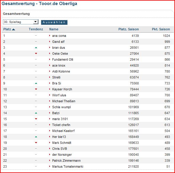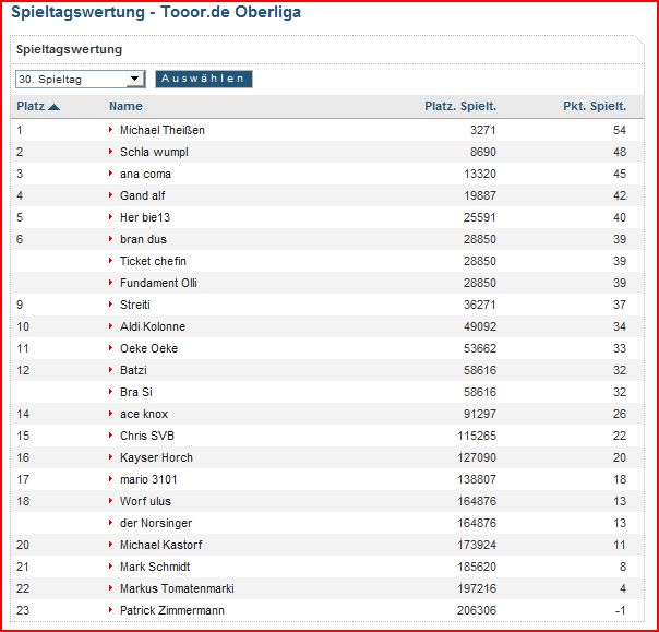 anacoma hat jetzt mehr punkte als der Spitzenreiter der Ehrendivision :mrgreen: allerdings hatte der einen ziemlich miesen Spieltag: nur 4 Punkte :shock: