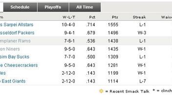 Kackmatchups?????? White und Addai haben Hammer-Matchups, auch bei Tony G., Colston, Hester, Orton, Garcia und Branch kann man von guten Matchups sprechen, finde ich. SD, CHI, NO, ATL und STL ham alle ne ziemlich schwache Pass-Defense. Nach Passing Yards allowed ist Atlanta auf Platz 23 noch die beste Defense. Ich würd da eher von Supermatchups sprechen. Aber verlierst trotzdem