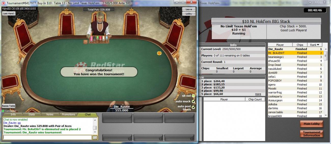 Mal unabhängig vom Thema; war gestern noch mal in Aachen pokern. Wollte ja eigentlich vorher bescheid sagen, aber war recht spontan, da Studentenpoker. Niveau war mMn eher schlecht; war aber auch sonst nicht so gut. Nur 45 Leute; paar Leute konnten ganz gut pokern, andere wiederum hatten nicht den Hauch einer Ahnung (minimumraise = BB, etc. war völlig unbekannt). Besagter Typ hat trotzdem alles gewonnen. Called Runner-Runner-Flush-Draw... Schlägt mit Pocket-Pair 7, die Jacks, etc. Absolut unglaublich!