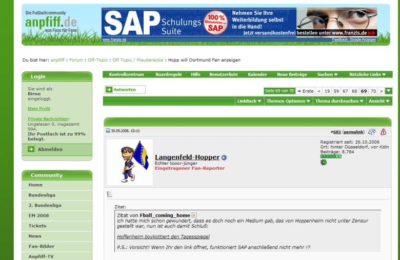 Am vergangenen Sonntag war beim Spiel der Hoffenheimer gegen Dortmund im Gästeblock ein Transparent zu sehen, das den Mäzen hinter einem Fadenkreuz zeigte, dazu der Spruch: „Hasta la vista, Hopp!“. Ein Zitat aus einem Schwarzenegger-Film; Fiktion, wenn auch brutale. Seitdem ist einiges anders. Der DFB nahm sich der Sache an, auf beispiellose Weise. Zum besonderen Schutz von Hopp will der Verband künftig Pöbeleien und Drohungen, die ihn betreffen, unnachgiebig verfolgen und vors Sportgericht bringen. DFB-Präsident Theo Zwanziger sicherte dem Milliardär zu, das Verhalten der Fans ihm gegenüber beobachten zu lassen.