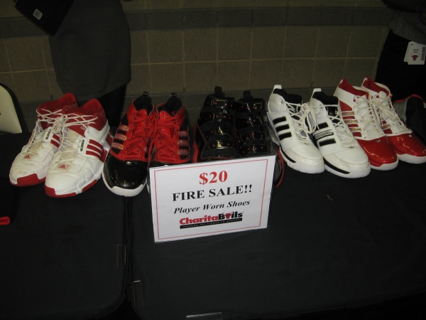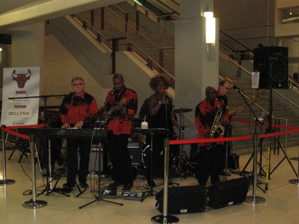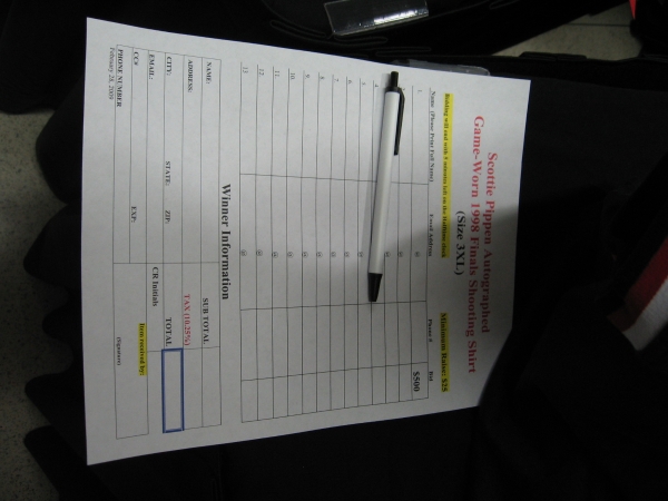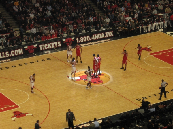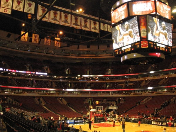 Endlich Einlass :D Ich bin gespannnt wie Hulle, was mich drinnen erwartet. Kaum reingekommen spielt direkt vor mir eine Liveband. Es laufen Menschen auf Stelzen rum und an jeder Ecke steht ein Marktschreier, der irgendetwas verkaufen will. Ich bin anscheinend auf einen Jahrmarkt geraten :mrgreen: Auf der entgegen gesetzten Hallenseite spielt noch eine zweite Liveband und oben auch noch eine dritte. Das hat mir als Musiker natürlich gut gefallen. Direkt neben der ersten Liveband war gleich ein "Pub" mit Stella :klatsch:. Ich hätte auch Vodka oder sonstige Hardalkoholika kaufen können. Soviel zum Alkohol bei den Bulls :rolleyes: Das Bier hat übrigens $7,50 gekostet :shock:. Der "Hotdog" (Pappbrötchen mit Würstchen der Größe meines Mittelfingers, sonst nichts weiter drauf) hat nochmal $5 gekostet. Frisch gestärkt mit einem Bier konnte ich mich nun meine anderen "Aufgaben" widmen. Erstmal die 6 Meisterpokale für Norton fotografieren... unten zweimal rum, oben zweimal rum. Nix :gruebel: 3 verschiedene Servicemenschen gefragt. Antwort Unisono: "they're not out today". Sorry Norton. Dann habe ich alle Fanartikel-Läden abgeklappert. Ein normales T-Shirt hat mondestens $25, einTrikot $65 - 100 gekostet. Man kontte auch ein Shirt signiert und getragen von Yao ersteigern. Mindestgebot $500 :mrgreen:. Jordan, Pippen oder Kukoc gab es erstaunlicherweise nirgends :gruebel: Ich habe mir dann mal nix gekauft :mrgreen:  peksim: für dich war dementsprechend auch nix dabei, sorry :winke: Nun aber ufff zum Platz und in die Halle. Groß ist die Schüssel ja, sehr beindruckend. Beinmäßig aber zu eng. Man muss immer aufstehen, wenn jemand durch will. Und das passiert leider auch während des Spiels sehr häufig.