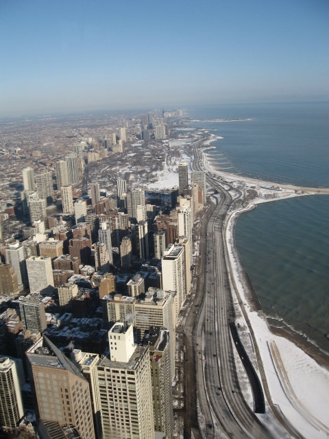 Man sollte aber besser nicht durch den Touri-Eingang im Souterrain gehen, sondern den Seiteneingang an der Südseite benutzt und drinnen die Wachleute nach der Bar weit oben fragen. Dann kann man kostenlos(!) zum 96. Stockwerk fahren, wo sich eine Bar und ein Restaurant befinden. In der Bar kosten Cocktails zwischen 12 und 15 Dollar. Die Cocktails schmecken zwar solala (wie überall in Chicago