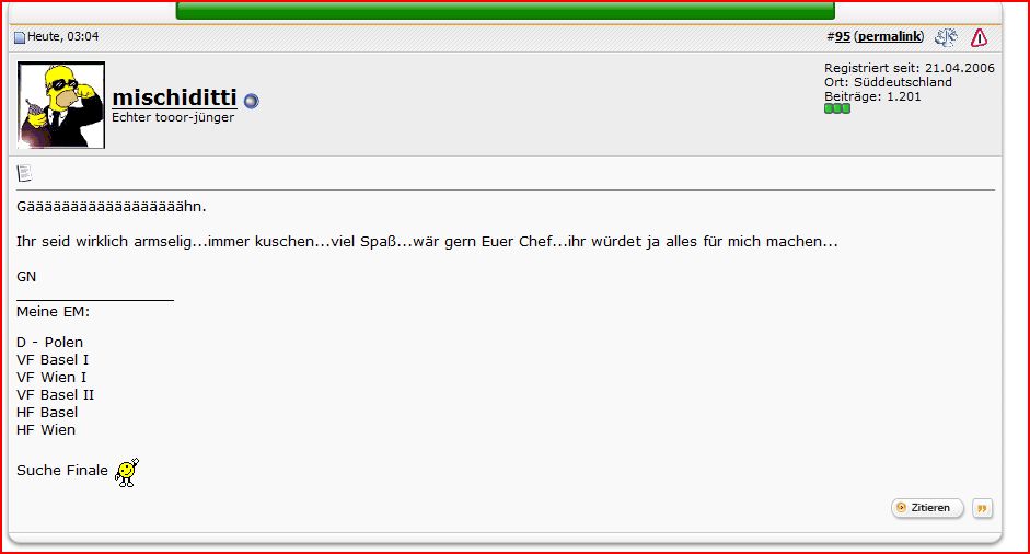 Ist eigentlich nicht meine Art. Aber soviel Dummheit hat die Veröffentlichung der PN verdient. Ich habe schließlich nicht um eine PN gebeten ![]()
