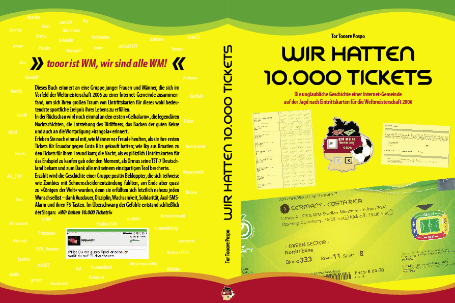 "Wer also noch einmal nachlesen möchte, was Ticker auf Vals Frage »Gibt‘s Tickets oder wo seid ihr alle hin?« geantwortet hat; wann HBabbe uns zum Lernen von Fremdsprachen aufrief; was Jünter Ende März von den Spielern während der WM forderte; welche User sbpride für die verrücktesten hielt; wann suitcase erst wieder duschen gehen wollte; warum khratoy den Ticketwahn schlimmer als Sexseiten hielt; von wem der Spruch »Willst du ein gutes Spiel anschau‘n, musst du auf F5 draufhau‘n!« stammt; wer sich am 22. April alles über Tickets freute und wer kurz vorher noch prophezeit hatte, dass es keine Eintrittskarten mehr geben wird; wann Jünter sich mit »Brasil ... lalalalalallalala ... Brasil ... Schlari-Schlaro-Schlaraffenland ... Alter, soviel Logins ... so viele Spiele!« im Überschwang der Gefühle outete; wer und wann Iky, unserer Kroatin, endlich die Kroatien-Tickets schoss; suitcase Anfang Mai einem Newbie erklärte, was man mit der F5-Taste startet; was Prinzessin in ihren Rasen mähen wollte; wer am 6. Mai alles Finalkarten abgegriffen hat; wem grover empfahl, sich einen neuen Biorhythmus zu kaufen; warum Juve-S zum Heulen zumute war; weshalb es nach Lautrers Meinung für die DHL besser sei, Männer zur Ticketauslieferung zu schicken; warum Miranda genau das Gegenteil für besser hielt; wer die »tooor.de-wm-ticket-simulation« für die Zeit nach der WM forderte; wie flsch die im Resale verkauften Tickets an die FIFA zurückschickte; wer im Stadion neben Heino, Otto, Udo Lindenberg und dem Papst sitzen wollte; was Prinzessin darauf für einen (nachvollziehbaren) Einwand hatte; für welches Spiel sich CharlysDad fast »irre« hämmerte; welche Ära flsch am 7. Juni für beendet erklärte; wer sich mit dem Combobox-Tool abmühte; über was sich Steffen2509 und flsch nachts austauschten; was Kartenfahnders Weltmeistertipp war; wann Musti die Pille forderte und ob Valderama doch noch Karten für die WM ergattern konnte, dem sei dieses Büchlein wärmstens empfohlen."