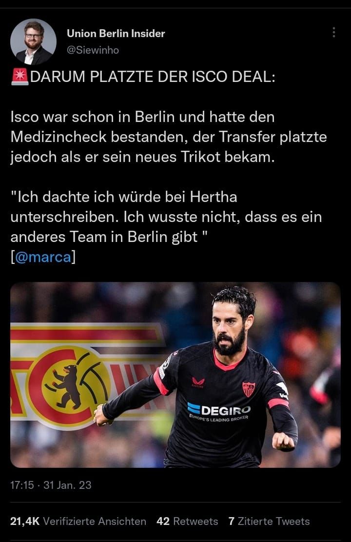 Jo. Und das lässt eben die eine oder die andere Vermutung zu. Möglich, dass Iscos Seite nochmal "nachverhandeln" wollte. Genauso möglich, dass Ruhnert im Wissen, die stärkere Verhandlungsposition zu haben (Isco ist vereinslos, wenn er bis heute Abend nix findet) nochmal paar Sonderwünsche hatte. Werden wir wohl nicht im Detail erfahren und die Außendarstellung dieses gescheiterten Deals ist für beide Seiten alles andere als glücklich.