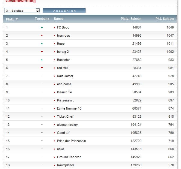 Endlich bin ich im Schnitt pro Spieltag so, das ich die 1000 knacke. Komisch finde ich nur das ich damit so schlecht bin, ich dachte eigentlich mit 4-stelliger Punktzahl ist man vorne mit dabei.