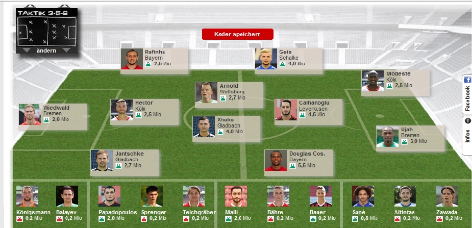 Beim Sturm gehe ich ins Risiko, aber der Rest ist, denke ich, ganz gut aufgestellt (die Kölner sind für ihre Qualität relativ günstig, hatte zwischenzeitlich auch mal Jojic und Bittencourt mit drin, bis mir angezeigt wurde, dass ich nur 4 pro Team einkaufen kann :rolleyes: ). :winke: