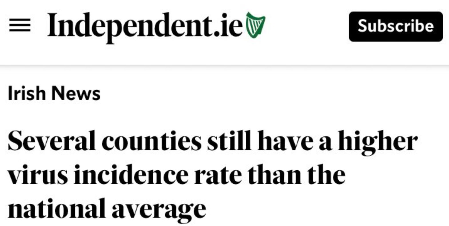 Naja, der schreibt einige Kreise haben IMMER NOCH höhere Inzidenz als der Durchschnitt. Das ist einfach eine Nullaussage, denn das war immer so seitdem es das Corona Virus in Irland gibt und das wird auch immer so bleiben, so lange es dort kursiert (also vermutlich für immer) - es sei denn, wie Du sagst, alle sind genau auf Durchschnitt, aber das ist wohl eine statistische Unmöglichkeit.