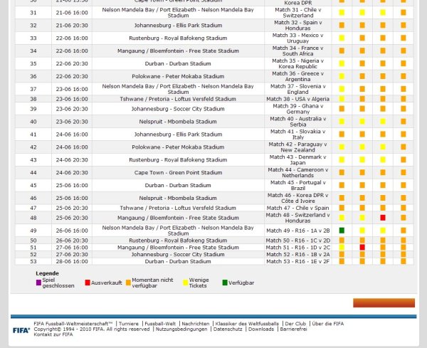 Dazu muß man aber sagen, dass der Ticketverkauf vor 4 Jahren technisch weitgehend ribungslos verlief. Ich habe meine großen Zweifel, ob die in RSA in der Lage sein werde, Resttickets bis einen Tag vor dem Spiel anzubieten-dafür haben die offenbar mit ihrer Technik viel zu viel Probleme. Ich würde jetzt nicht mehr unbedingt darauf spekulieren.![]()