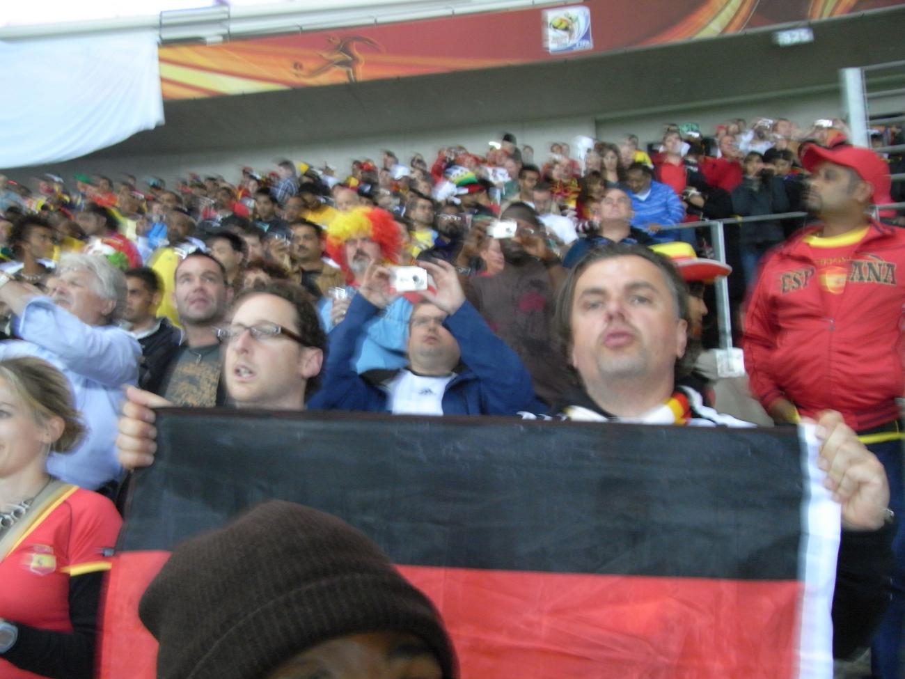 Vor dem Spiel dann nach Morningside noch etwas essen und vor allem trinken. Da die Bar den Namen „ Havanna“ hatte ,probierte ich dann nach dem zweiten Bier den Rum .Da hinter uns noch ein paar indische Durbaner in Deutschlandtrikots Kontakt zu uns aufnahmen , wurden wir noch zur Fanfreundschaft mit einem Glas Red Bull, in das ein kleines volles Jägermeisterglas reingestellt war, „verwöhnt“. Nachdem wir dann noch an die Bar gingen, gesellten sich noch 2-3 einheimische Typen ( der eine hieß Konrad)mit dessen Afrikaans sprechende Mäusen in Deutschlandtrikots zu uns und nach ein paar gemeinsamen Fotos ging es dann zu Fuß zusammen ins Stadion . Dort trennten sich leider unsere Wege , dafür trafen wir in unserem Block Maca, JayGee ,Sugar , Grover , Gausti und ich glaube mich auch an Scherzinho ,Berezin , Wackel und Thorsten H. zu erinnern. Mit Maca und JayGee haben wir dann gemeinam versucht, die Nationalhymne mitzusingen. Nach der Kontrolle auf meinem Camcorder würde ich sagen, daß dies nicht für weitere Empfehlungen bei S tefan Raab ausreicht. Mein Sehvermögen war dann in der zweiten Halbzeit etwas eingeschränkt und nach der Chance vom Tony Kroos erst einmal durchatmen und aufs Klo. Natürlich das Tor verpaßt. Der Rest des Spieles war so , wie mein eigener Zustand und so ging es dann auch zügig zu Fuß ins Hotel. Ich glaube , wir sind fast eine Stunde gelaufen, immer dem Strand entlang.
