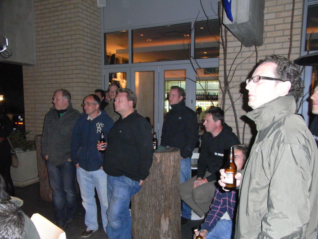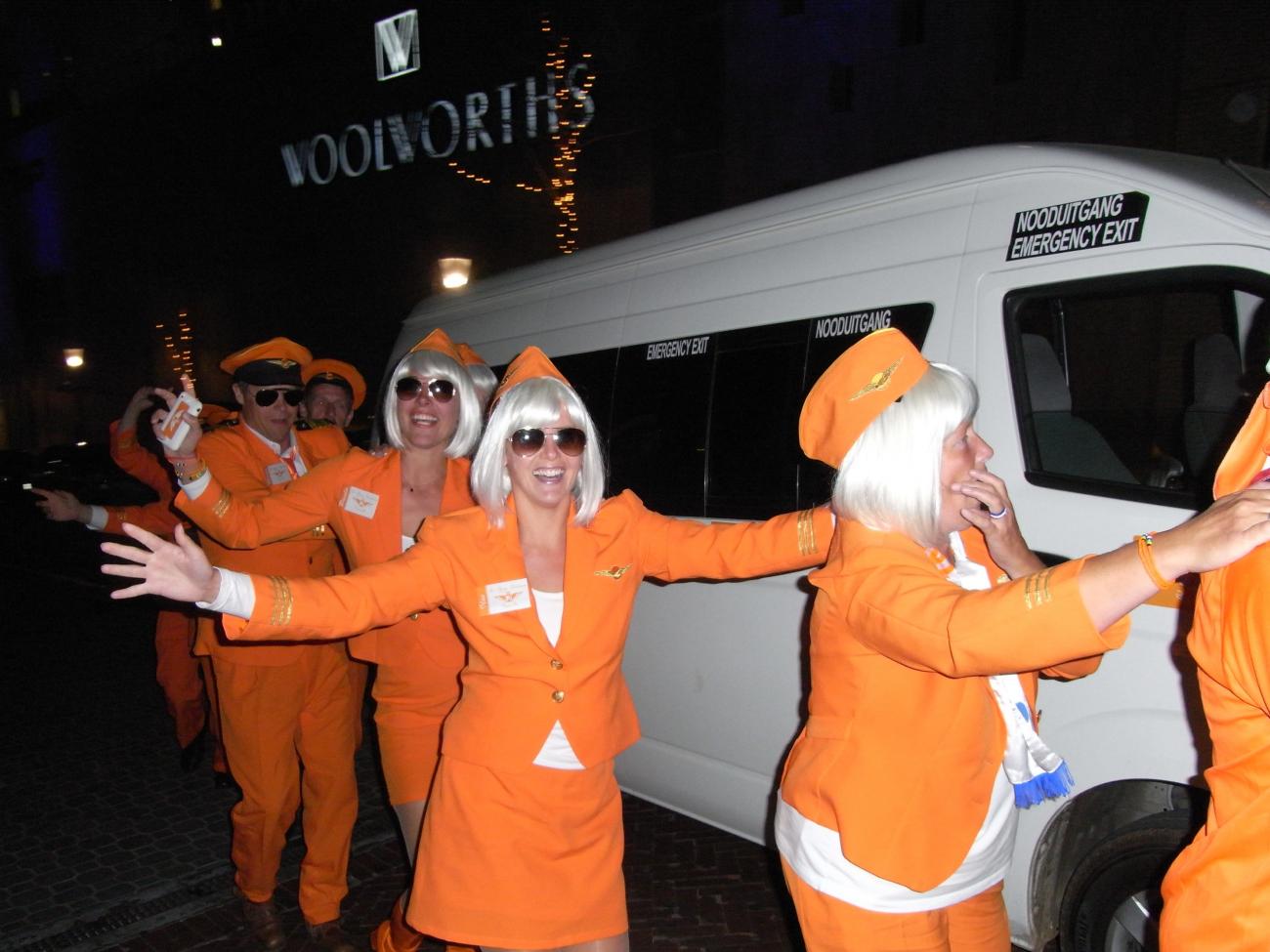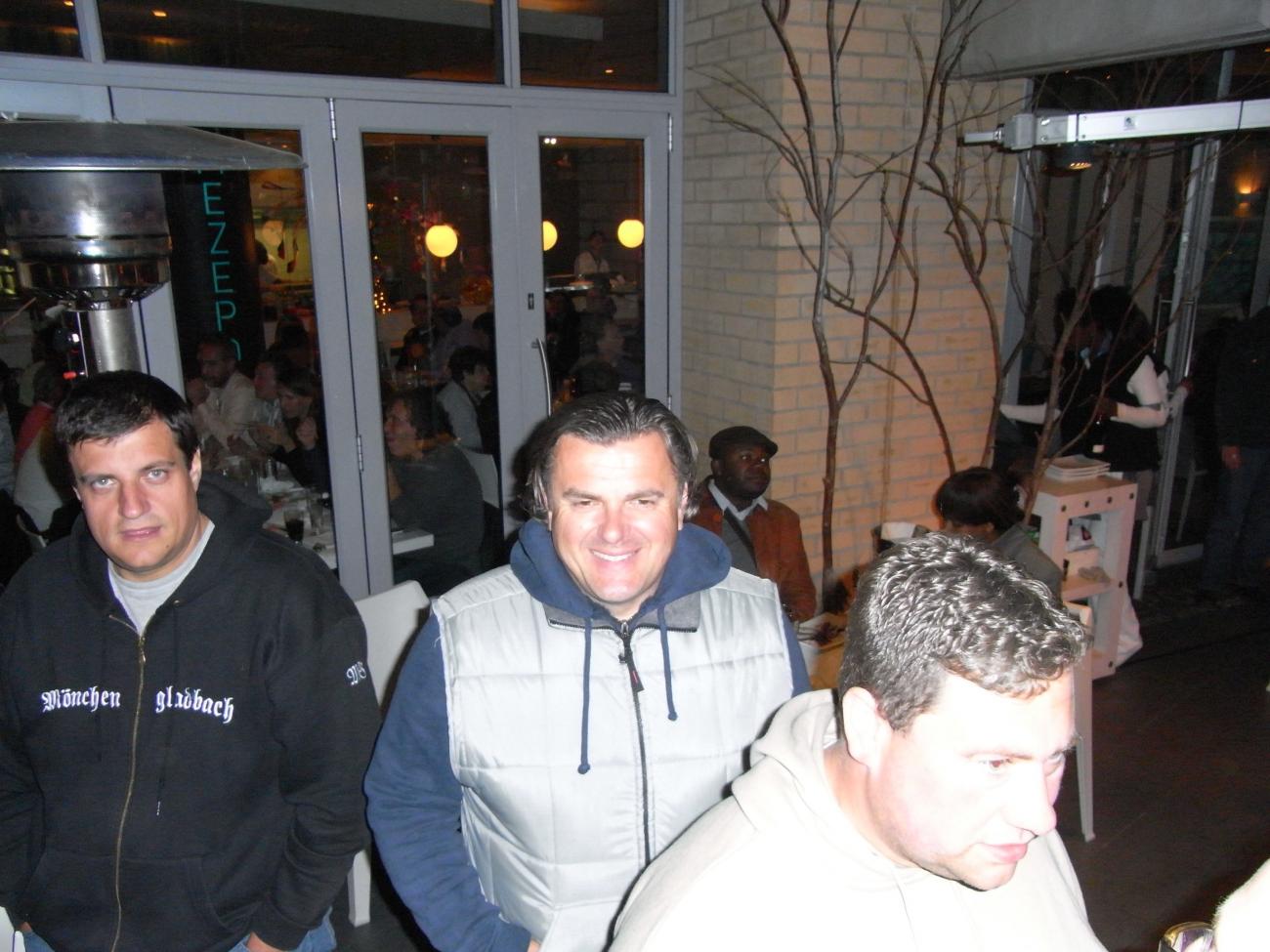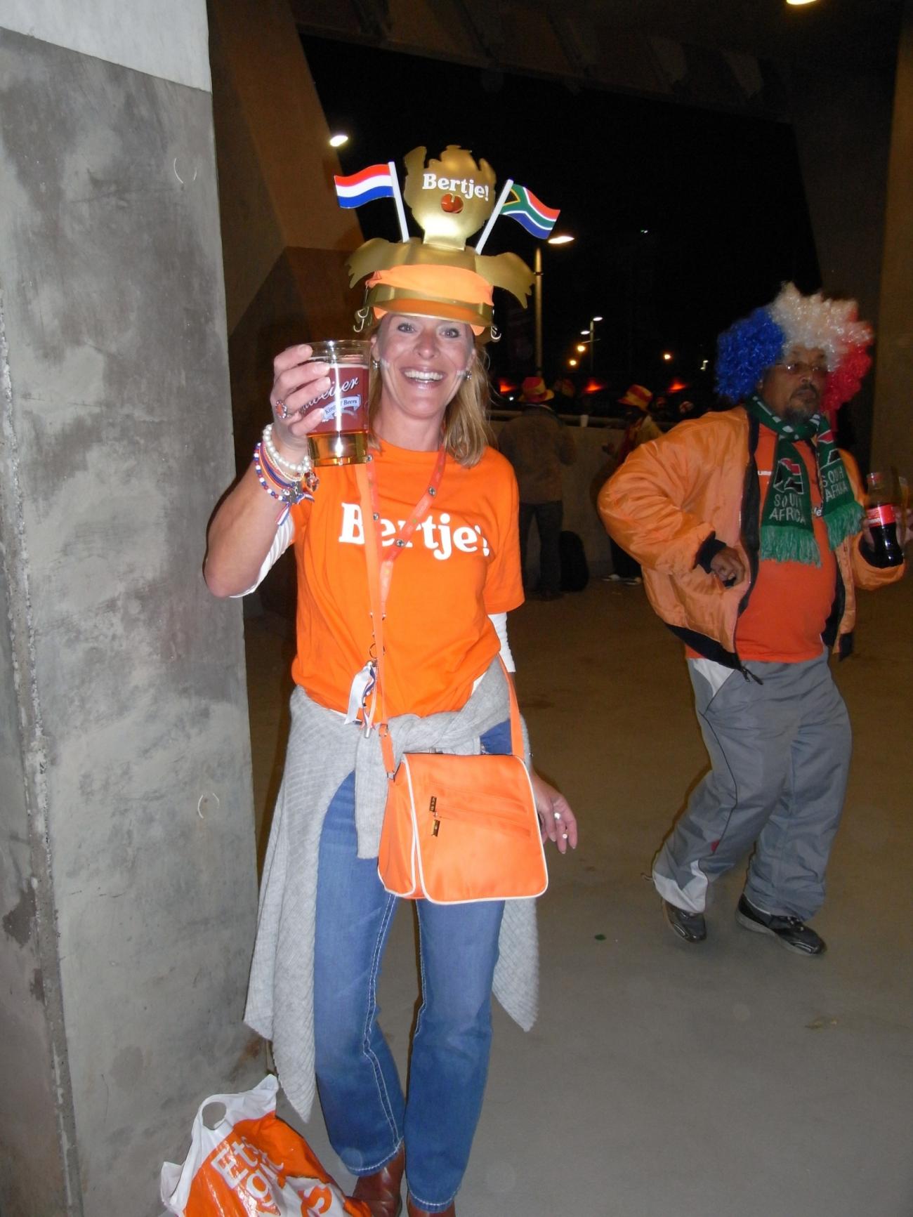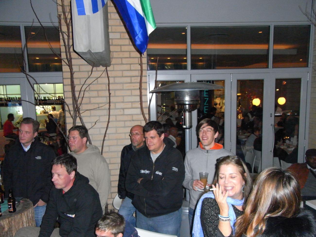 Am Samstagmorgen zurück in die Mall ,erst Geschenke für daheim besorgt und anschließend mit Maca und Sox ,die soeben aus Johannesburg eingetroffen waren ,ein 500g Steak und 2-3 Bier in der Kneipe „ Dros“ verdrückt. Abends dann zum Fanfest nach Melrose Arch um wenigstens Platz 3 zu retten. Wir hatten für 17 Uhr ein Sammeltaxi geordert , dessen Fahrer sich um 17:15 Uhr telefonisch meldete ,das er noch 3 Minuten zu uns benötigen würde .Aus den 3 Minuten wurden 30 und wir suchten uns das nächstbeste Sammeltaxi . Da dies mehrere Aufkleber vom Sender ARD drauf hatte ,schien es uns relativ kompetent ,um uns nach Melrose zu bringen . Aus den nötigen 12 km wurden dann fast 30 ,da der Fahrer diesen modernen Stadtteil nicht kannte .Aber immerhin angekommen und wir wussten dann auch , warum Melrose den Zusatz Arch bekam, denn es war Ar(s)ch-kalt. Zudem wurde uns dann noch eisgekühltes Bier serviert und auf die Nachfrage beim Kellner, ob es auch normaltemperiertes Bier gäbe , sagte er ,wir sind hier in Afrika und da ist kaltes Bier an der Tagesordnung. Ich wärmte mich dann eben an den aufgestellten Heizstrahlern und am eisgekühlten Bier. Zwischendurch kam dann auch noch ein Bus mit orangeuniformierten Holländermädels , die um ihren Bus eine Polonaise tanzten und dann in der Fanfestmenge untertauchten .Wir waren eine schöne Ansammlung von erlauchten Tooor-Kameraden am anderen Ende der Welt und ich hoffe ,ich bekomme sie jetzt noch alle zusammen .