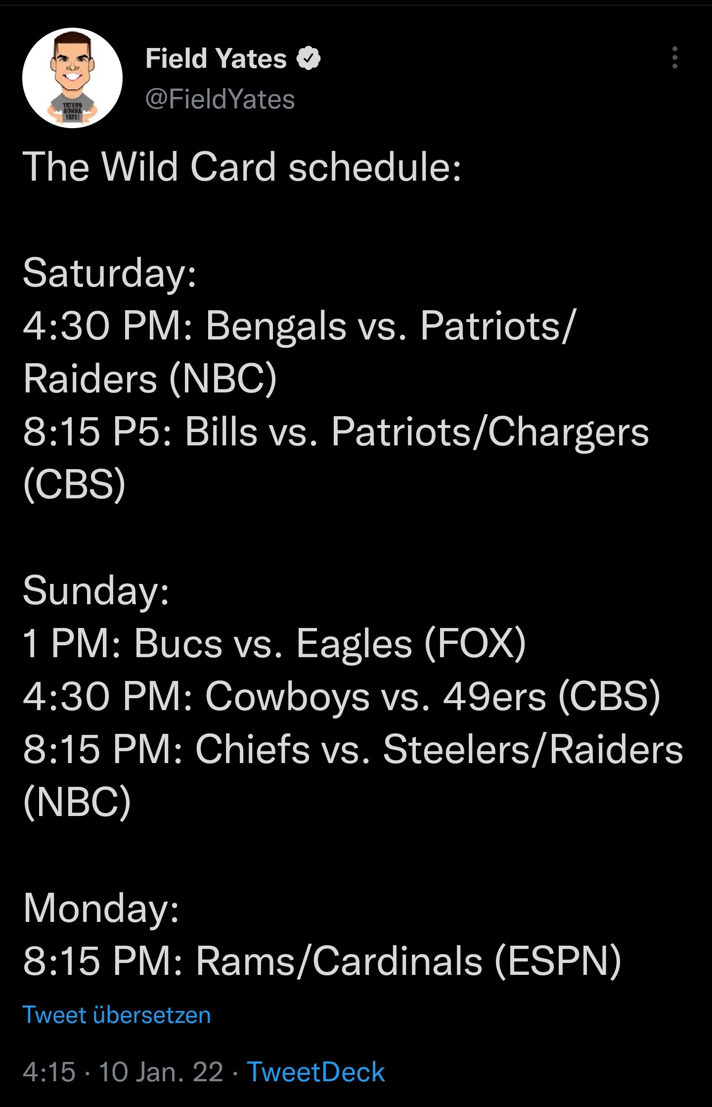 AFC mal sehen, wie es dann final aussieht, das Gewürge der Steelers hätte ich persönlich nicht unbedingt nochmal gebraucht, aber was soll's, wird wohl dabei bleiben.