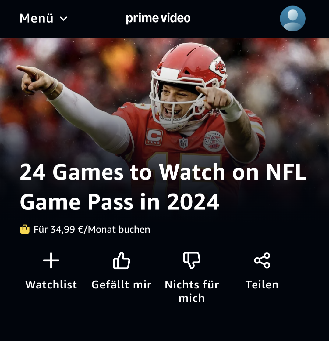 "Zusätzlich müsst Ihr 34,99 Euro für den NFL Game Pass im Monat bezahlen, um alle NFL-Spiele der Saison 2024/25 live im TV und Livestream bei Amazon Prime zu sehen."