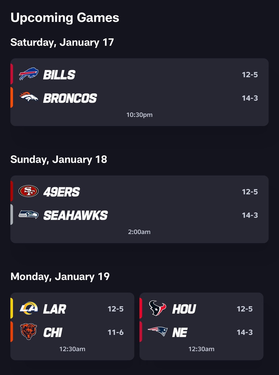 Sonntagsspiele sind natürlich nicht zeitgleich. Erst Patriots 3pm ET dann Bears 6:30pm ET.