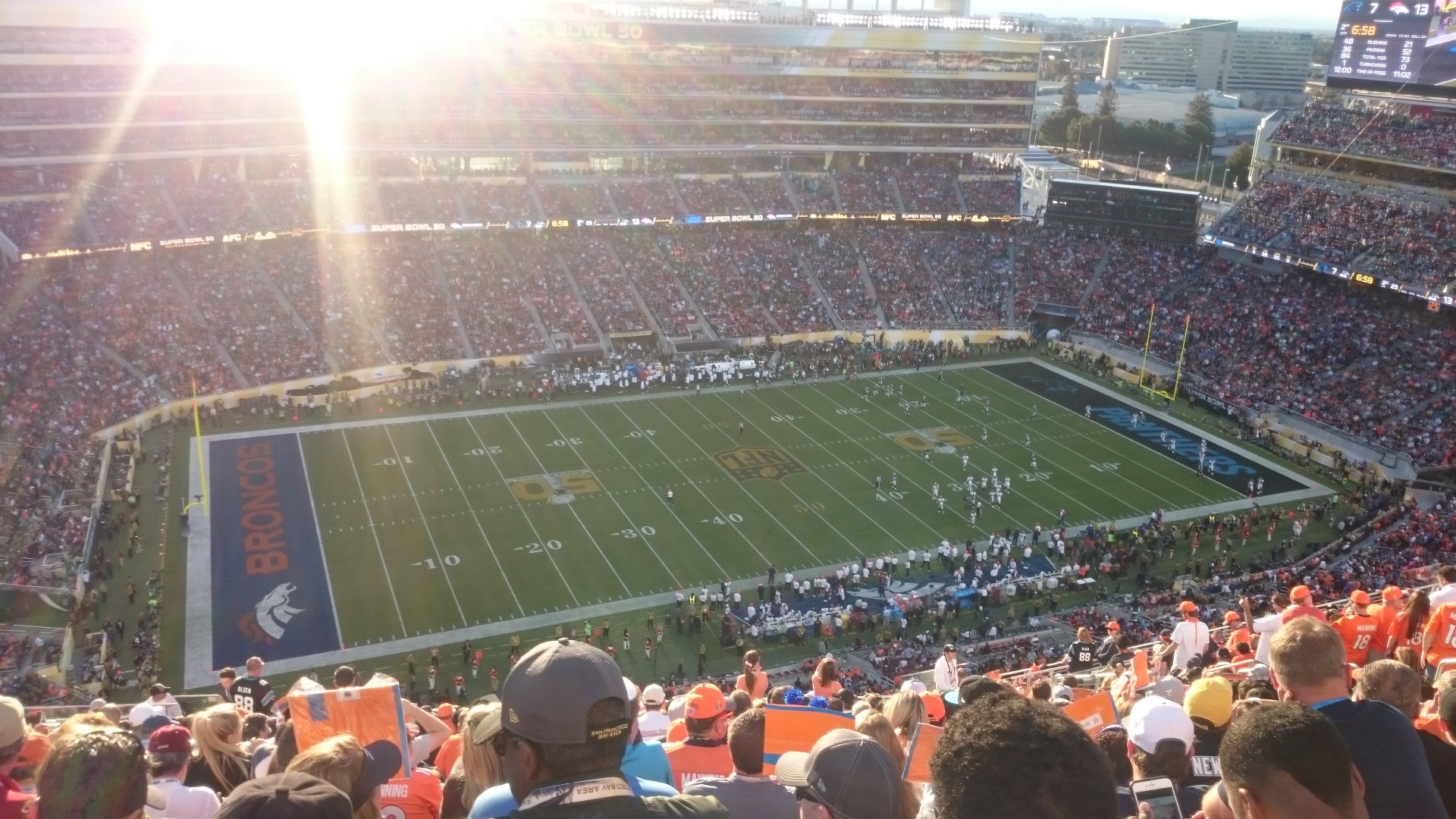 Insgesamt hat alles wunderbar geklappt, die ganze Reise war ja lange im voraus geplant und ich liebe das, wenn ein Plan funktioniert :mrgreen: . Der Sonntag war dann einfach nur warm, heiß, schön, geil. Ging morgens früh los mit dem Mietwagen nach Santa Clara, da dann ne Pre-Game Veranstaltung mit Essen und Trinken bis zum Abwinken. Nett gemacht. Von da ins Stadion. Abgesehen davon, dass man durch Metallscanner musste (wie zu jeder anderen Veranstaltung in der Stadt auch), waren die Kontrollen doch eher überraschend schnell erledigt. Im Stadion selbst ordentliche Plätze gehabt, Sicht war gut. Wie auch in der Stadt ein klares Übergewicht der Broncos Fans. Die Berichte über ein sehr heißes Stadion kann ich bestätigen. Die Sonne brannte, es war unglaublich heiß. Ich kann schon verstehen, wenn da einige Fans zu noch etwas wärmeren Jahreszeiten da mal für ein paar Minuten aus dem Stadion verschwinden um sich abzukühlen. War aber insgesamt für amerikanische Verhältnisse wenig Gerenne zu den Verpflegungsständen und zurück. Akkustik war recht bescheiden. Ging im Oberrang zumindest viel verloren und das hätte sicher einiges lauter gedurft, sowohl Hymne als auch Halbzeitshow. Spiel hat ja jeder gesehen, den es interessiert. Klar gab’s da schon wesentlich interessantere Spiele, aber ich fand den durchaus akzeptabel und bin sehr froh, dass es nicht wie vor zwei Jahren eine einseitige Veranstaltung war. Da schau ich mir lieber so ein Spiel an als ein 43:8. Und da ich mich auch auf die Broncos Seite geworfen habe, alles richtig gemacht.