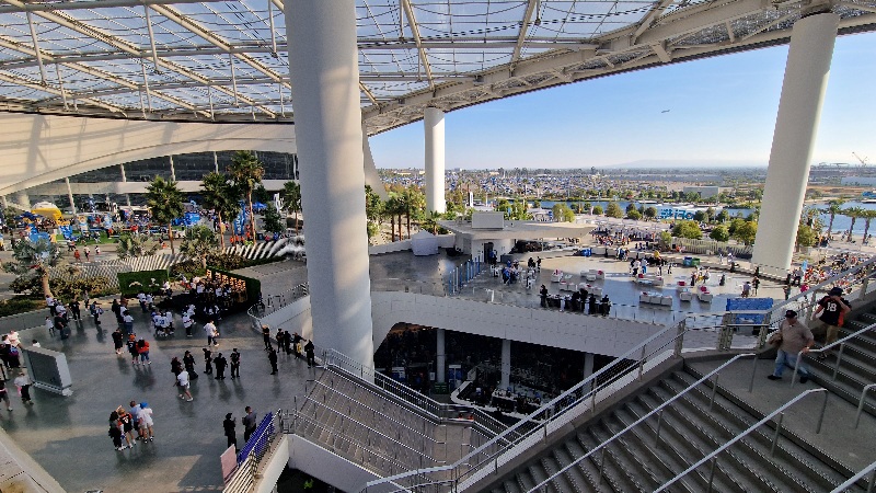 aussen riesig, das können keine bilder darstellen, ihnen auch!! trotzdem nur knappe 70.000 plätze. sowas is wirklich schwer zu erklären, sieht optisch auch nicht so aus, is aber tatsächlich so und es gibt auch kaum platz für die zusatztribünen. wir haben uns alle für breite massen zugänglichen teile des stadions angeschaut, nur ganz wenige sichtbehinderungen wenn überhaupt, betrifft maximal hintere ecken der endzonen, hätte man aber sicher noch besser machen können. das einzige was richtig stört, allerdings nur im oberrang, ist halo display, das ding sticht leider direkt und gewaltig in die augen, versperrt aber überhaupt nicht die sicht auf spielfeld. display selbst is aber out of this world, genial konzipiert, weltklasse bildqualität und man sieht von jedem platz alles was darauf abgespielt wird. da haben sie aus fehler in atlanta gelernt. nur halt etwas irritierend für die obersten zwei ränge. apropo ränge, im fünften rang braucht man genau wie in dallas ein fernglas. ich bin mir auch nicht sicher ob man wirklich 5 ränge gebraucht hat, vermutlich schon aber nur um 5 skyboxes ebenen sinnvoll einzubringen, plus eine sinnlose sechste am spielfeld level, eigentlich darunter). so oder so nie ein stadion mit sovielen boxen und lounges gesehen, alle aber, bis auf field level halt, super integriert. ich habe auch bei weitem noch nie soviele verkaufsstände in einem stadion gesehen, egal was man braucht muß man sich nicht lange anstellen! echht genial! vllt liegt es aber auch ein wenig an den preisen? am platz mangelt es auch hinter den trinünen nicht, sehr breite gänge usw. aber das war doch klar! zugang daher problemlos, abgang auch. umgebung schön gemacht, lake vor dem stadion weltklasse, nfl und nfl networks gebäude riesig! tailgating leider nur an zwei parkplätzen erlaubt, irgendwie nicht im nfl sinne, hat zwar mehr mit organisation als mit stadion selbst zu tun, trotzdem sehr enttäuschend! zufahrt und abfahrt auch problemlos. offentlich schon 30 min walk (geschäzt) aus dem norden und etwas länger aus dem süden (40-45 min), je nach dem welche u-bahn man benutzt. bleibt zu hoffen dass sie wie geplant für die eventtage eine der linien, bis zum stadion ausbauen. nicht nur wegen stadion selbst, das legendäre la forum ist auch da und neue clippers halle demnächst auch! ausbau is derzeit für die olympia 2028 geplant, schön wäre es wenn sie es schon für die WM bereitstellen würden. apropo WM, stadion ist für american football, konzerte und andere US events designed, leider aber nicht zum fussball, dafür müsste man spielfeld mindestens bis zur ersten reihe hochheben (cca 3m) und auch stadionecken entfernen. das wird für die WM auch vermutlich gemacht, aber für andere fussballevents kommt das sicher nicht in frage. wegen “geringer“ stadionkapazität und ungünstiger zeitzone wird es auch vermutlich nicht als finalort in frage kommen, was eigentlich megaschade ist. das ding is genial, hat dach aber keine wände und eine orientirung die leichte wind brise und angenehme verhältnisse garantieret. das wäre eine perfekte voraussetzung um ein weltklasse finale auszutragen! das ding is einfach weltklasse … das beste american football stadion ….fullstop!
