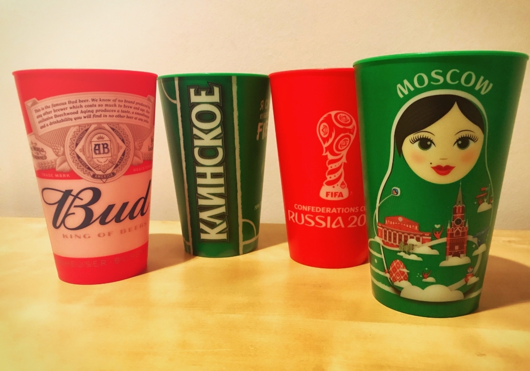- grüne Becher der einheimischen Brauerei (irgendwas-skoje) der Spielorte mit hübschen Mädchengesichtern als Matrjoschka