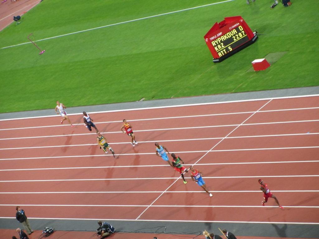 Leichtathletik: Ist natürlich auch ganz anders als im Fernsehen. Oft verwirrend, weil viele Dinge gleichzeitig stattfinden. Wir waren am Samstag im Stadion, als die Briten in einer Stunde alles abräumten. Obwohl wir direkt über der Weitsprunggrube sassen, habe ich den weitesten Satz von Rutherford zB gar nicht mitgekriegt, weil parallel dazu der entscheidende 800m Lauf vom Siebenkampf losging. Und zu den Laufwettbewerben: das Problem beim 100m Lauf ist eben genau der Sinn der Sache: die sind so schnell. Das ist eben verdammt schnell vorbei. Zum Zuschauen fand ich den 10.000 Meter Lauf eigentlich viel interessanter. Ebenfalls Wahnsinnslärm, als Mo Farah durchgezogen ist.