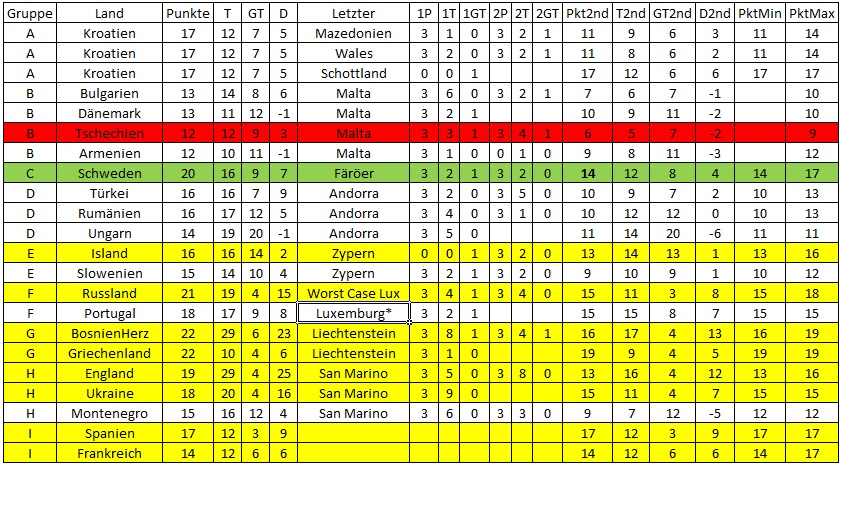 Schweden in Gruppe C steht als Gruppenzweiter fest und kann nicht mehr schlechtester Gruppenzweiter werden. Die Gruppen C, G, I sowie die Teams aus Island, Russland, England und der Ukraine habe ich gelb markiert. Wenn diese Gruppenzweiter werden, bringen sie mindestens 13 Punkte mit (PktMin) und sind damit in den Play-Offs.