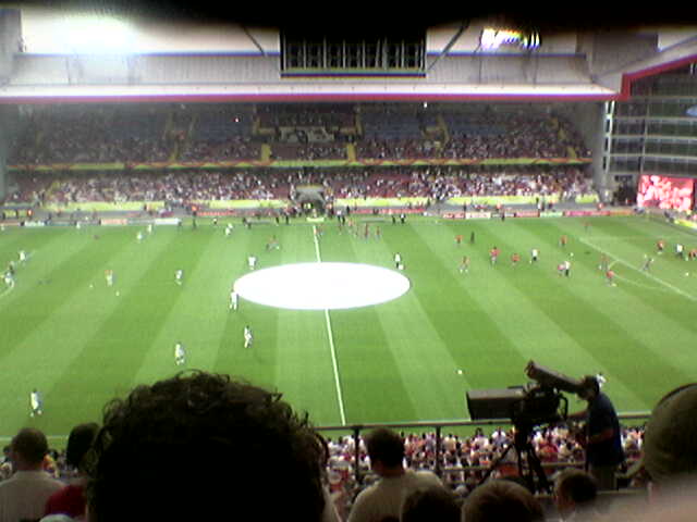 Die Plätze neben uns, wo besagter Pfeiler wohl das Tor ganz oder teilweise verdeckt hätte, waren wohl nicht verkauft: nach Spielbeginn saßen da auf einmal lauter hellblaue Volunteers..... -