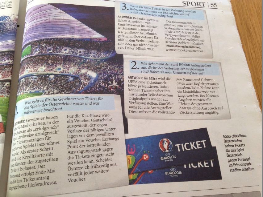 Heute ist in der Zeitung (AT) gestanden, dass die Tickets vom Ticketportal der UEFA ALLE personalisiert werden müssen. Also nicht nur der Kartenbesitzer wie bis jetzt.