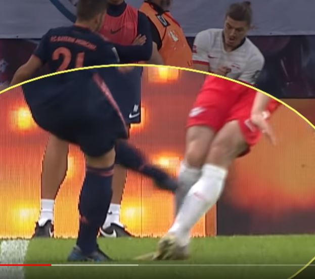 Mein Bild ist ne Millisekunde früher, wo man ganz klar sieht, warum der Fuß von Hernandez kurz darauf am Schienbein von Sabitzer ist: Der schlägt ne Flanke in den Sechzehner wobei er natürlich den Fuß duchschwingt.
