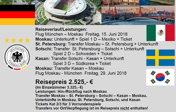 Einige Reisepakete sind schon raus von den Fanclubbetreuern inkl. Tickets für die Spiele. FCN Süd mit 2 oder 3 Spielen 15.06. bis 26.06. oder 29.06. für 2T€ oder 2,5T€.