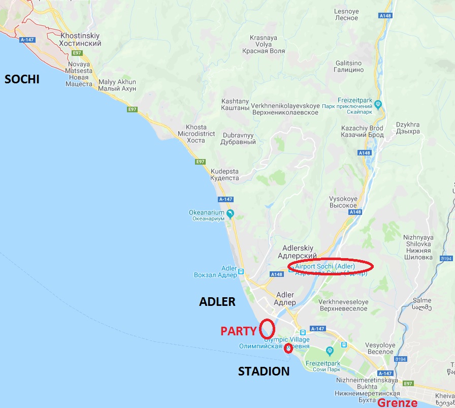 Habe dies mal auf der Karte kurz festgehalten. Meisten Fans (auch Schweden) werden wohl in Adler sein, und damit auf der dortigen Partymeile. Nicht wundern, wenn aus einem Haus deutscher Schlager kommt, da wohnt Tante Marta (und nicht gleich wieder die Helene ausbuhen...). :bier: Über den Fluss (zwischen Adler City und Stadion) gibt es eine Fussgängerbrücke - kein Problem. Dirkt im Olympiapark alles sehr weitläufig, viele russische Touristen, schauen sich abends Wasserspiele an der olympischen Fackel a la Bellagio an. Bilder und Impressionen unter http://www.dirk-in-russia.tumblr.com/