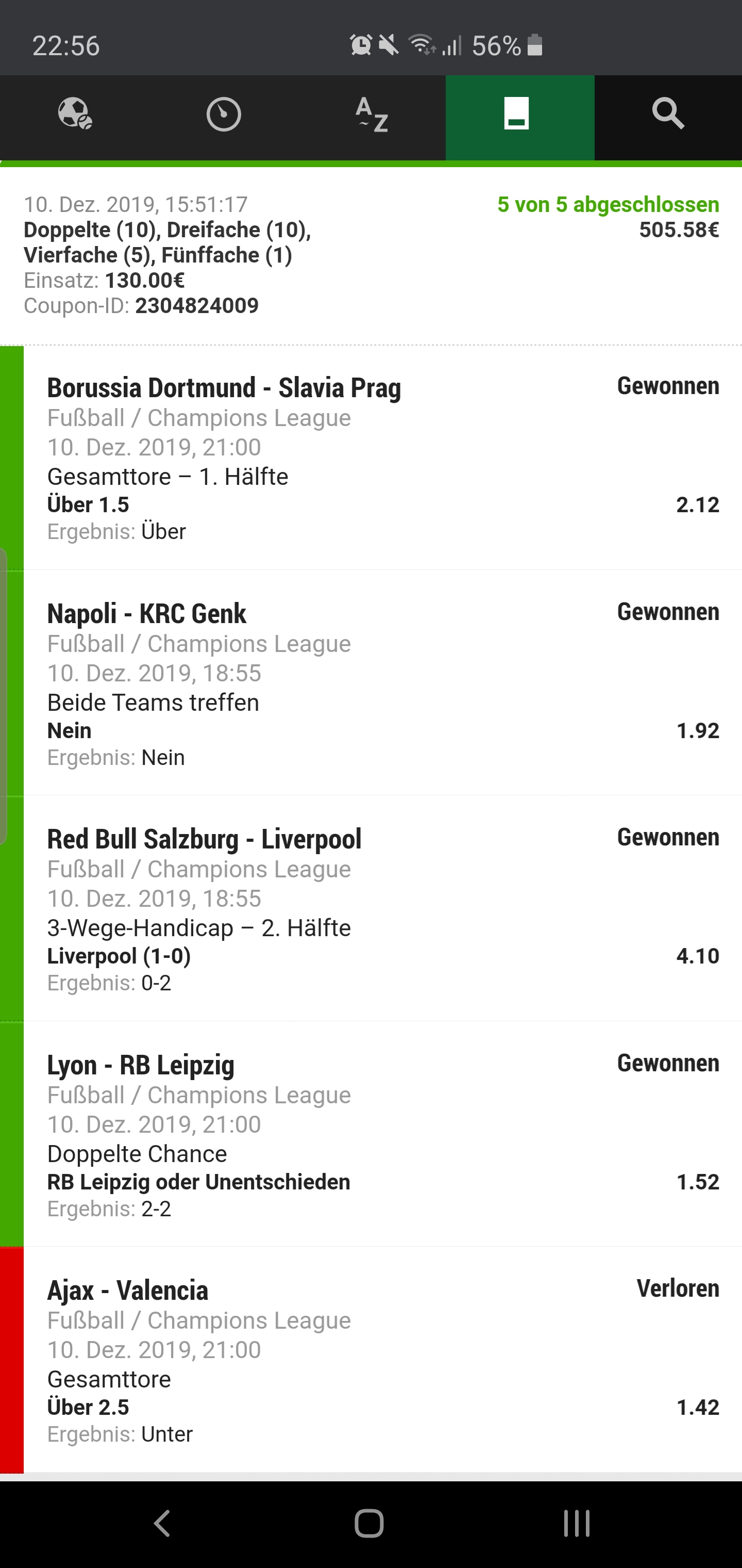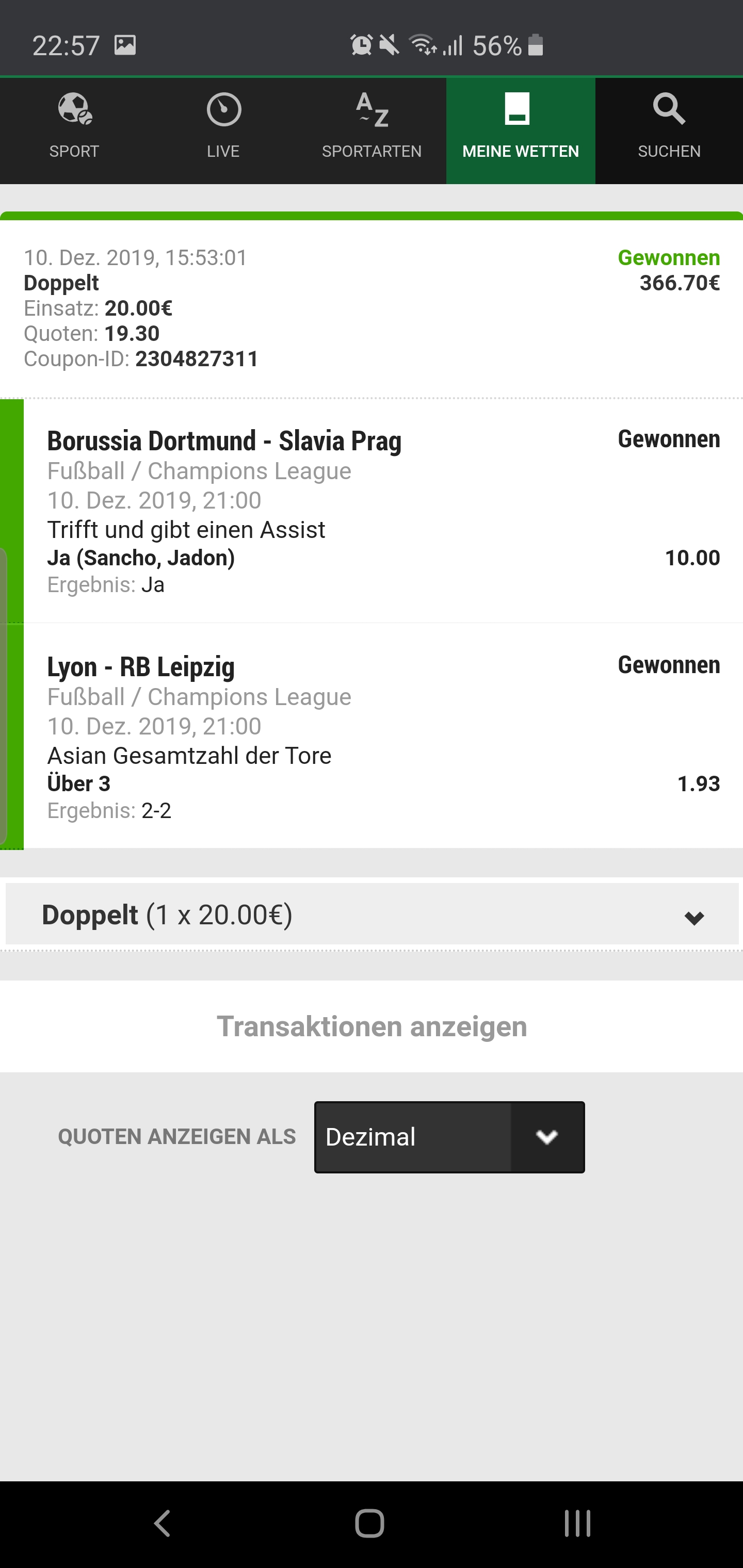 Ich hab seit Ewigkeiten auch Mal wieder getippt heute und u.a. die Liverpool Idee (allerdings konkret für HZ2) aufgegriffen. Lief echt gut, Ajax hat leider nicht ganz mitgespielt, aber insgesamt top.