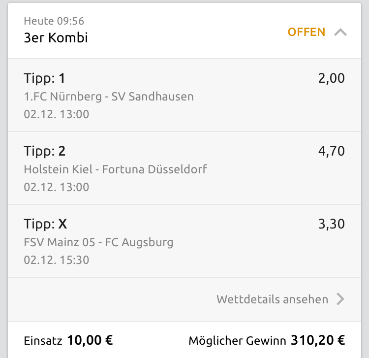 Je nach Zwischenstand und Spielverlauf noch live verkaufen. Bspw. FCN führt in der 88. 1:0 und das Angebot ist gut. Annehmen und auf 1:1 hoffen. Dennoch drücke ich dir die Daumen das Nürnberg es schafft.