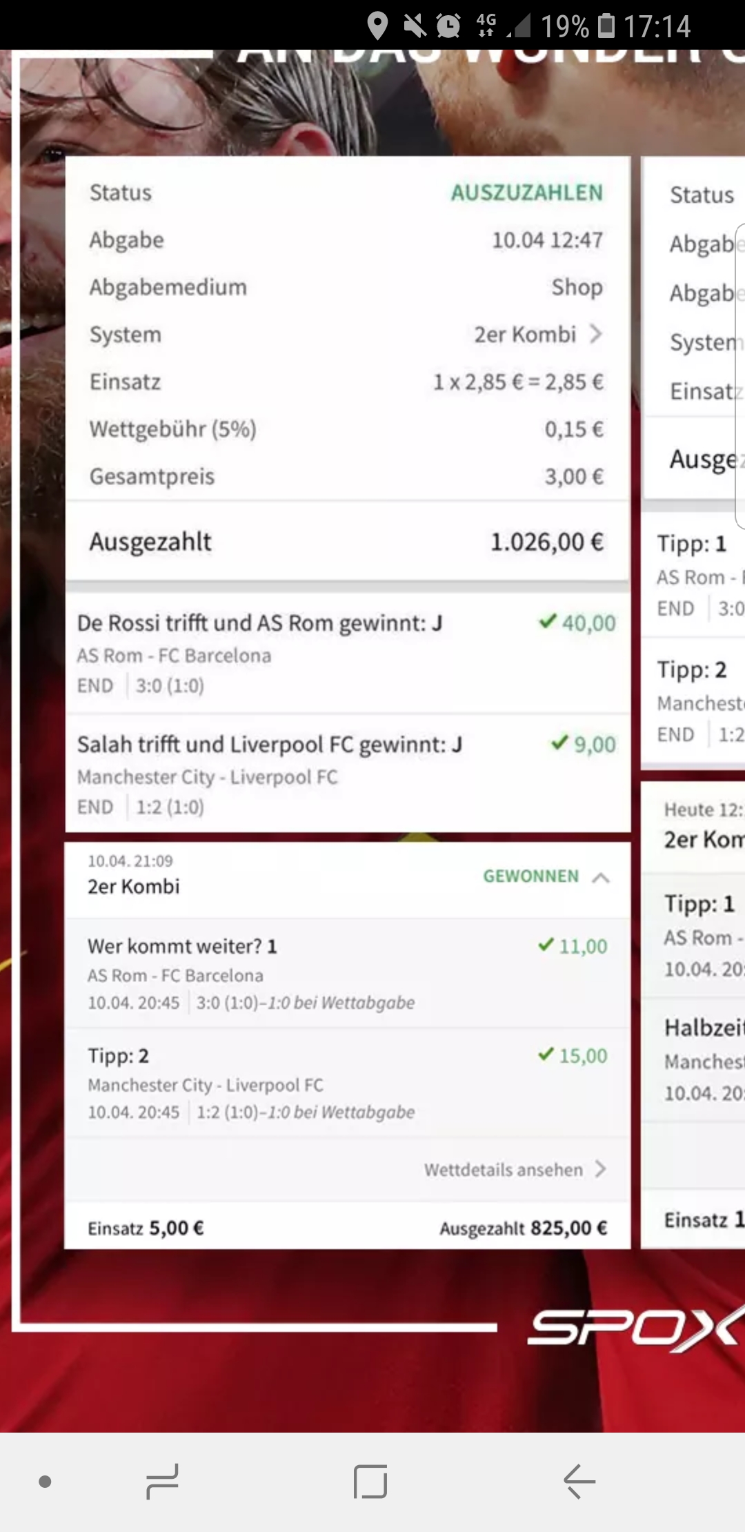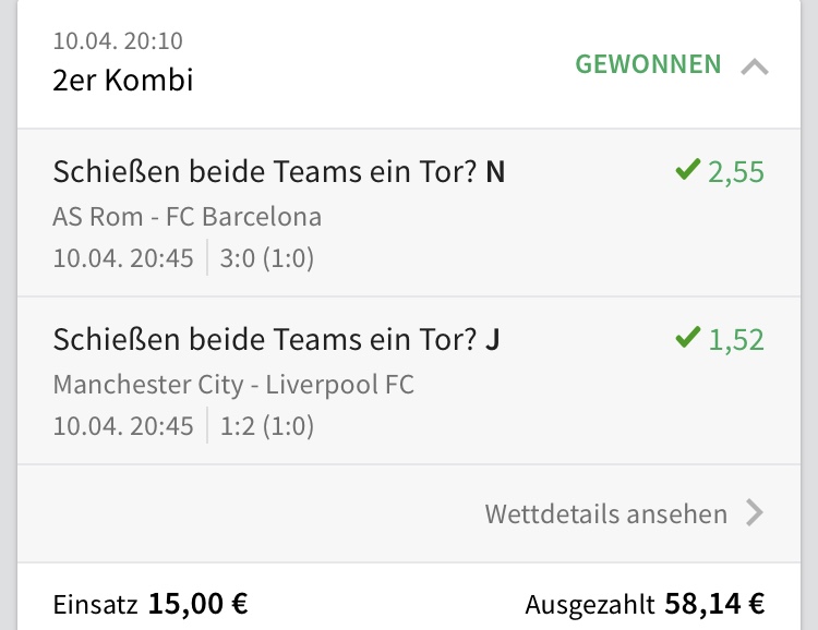 Glückwunsch. Habe meine leider verloren. Hatte auf Barca gesetzt. :mad: