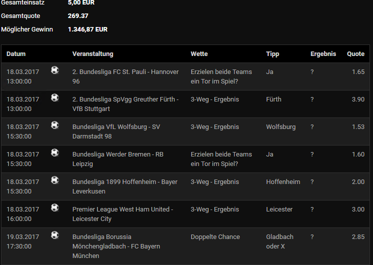 Frankfurt - Gladbach Tipp X (3,20)Gesamtquote: 65,54