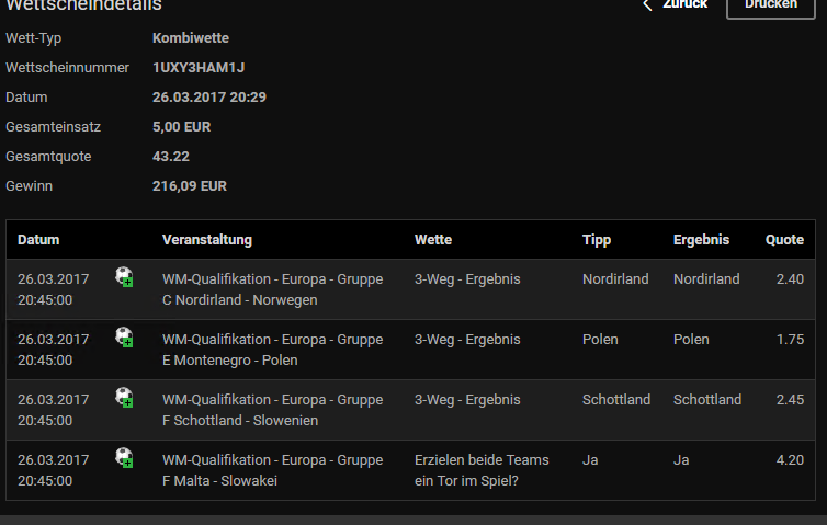 Ich hab eine 20er Kombi gemacht (nur als Spaß) ... 20 Spiele - diverse Ligen alles Über/Unter +1,5 und 10€ Einsatz.