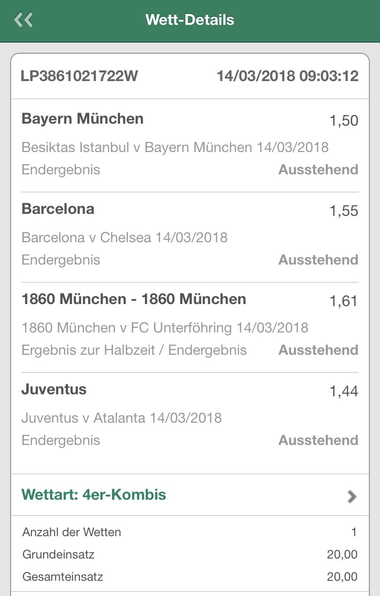 Sagen wir mal so, unter normalen Umständen sollte es klappen, aber ich finde die Quotenverteilung schlicht und ergreifend falsch, also zu sehr pro Barca. Mehr Value liegt für mich in Chelsea bzw in sowas wie -2,5