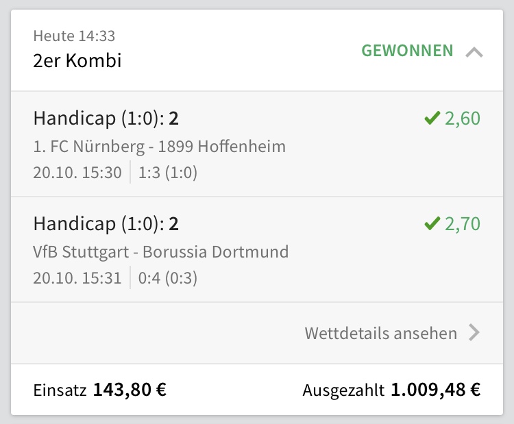 1. 1,50€ auf 2:0 & 0:3 (richtig)