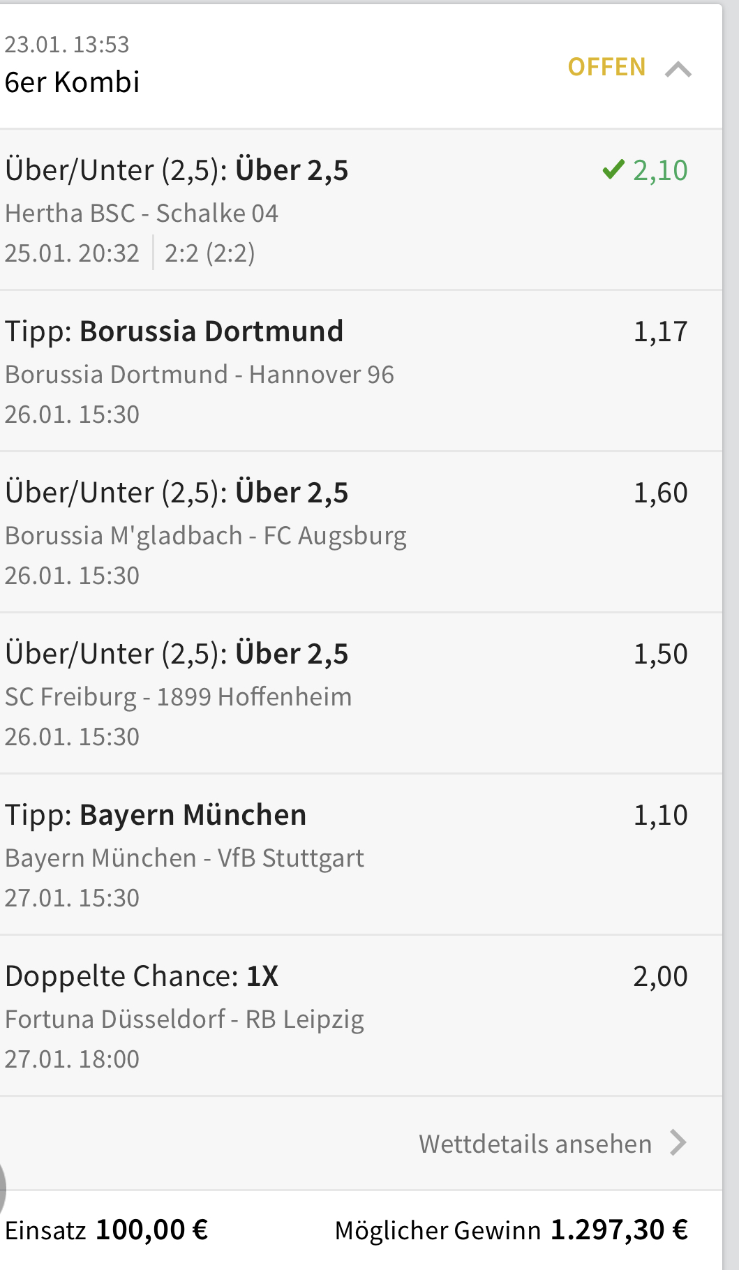 War eine Nullrunde mit 3 Punkten für Borussia :klatsch: . Hätte die 2. Wette nach dem 1:0 für kleines Geld verkaufen sollen, aber habe ich nicht. Dafür mit dem unverschämten 11er, der aber auch keiner war, Glück gehabt.