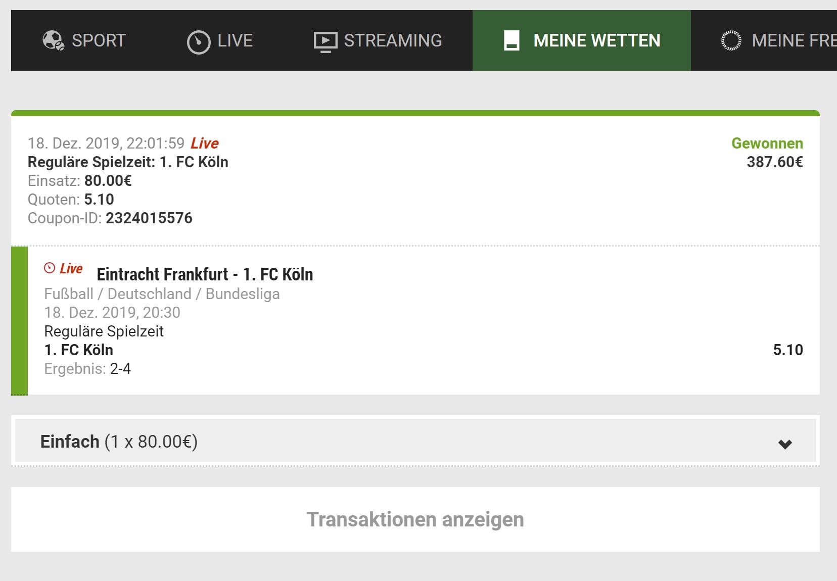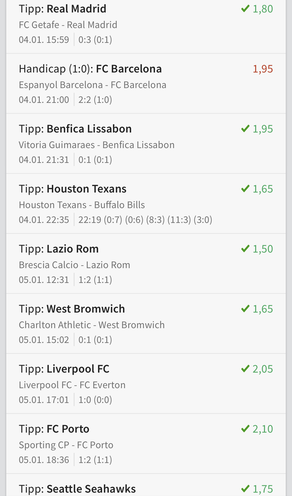 Genauso verhält es sich mit Sportwetten. Eigentlich kann man sich die "fishing for compliments" Postings ja sparen, hier nur Ausschnitte von erfolgreichen Wetten zu veröffentlichen. Oder allenfalls die knapp gescheiterten, um auf Verein X zu schimpfen. Aber es ist ja eben doch ganz geil. Hat dann allerdings keinerlei Mehrwert für den Rest des Forums.