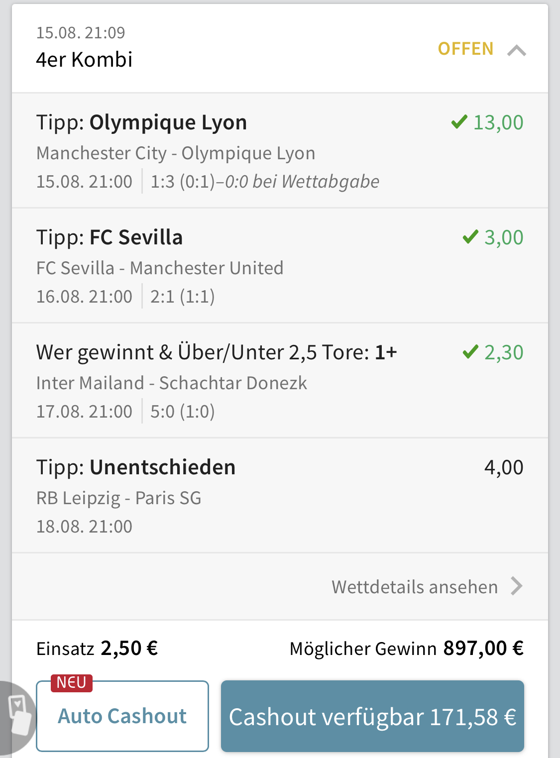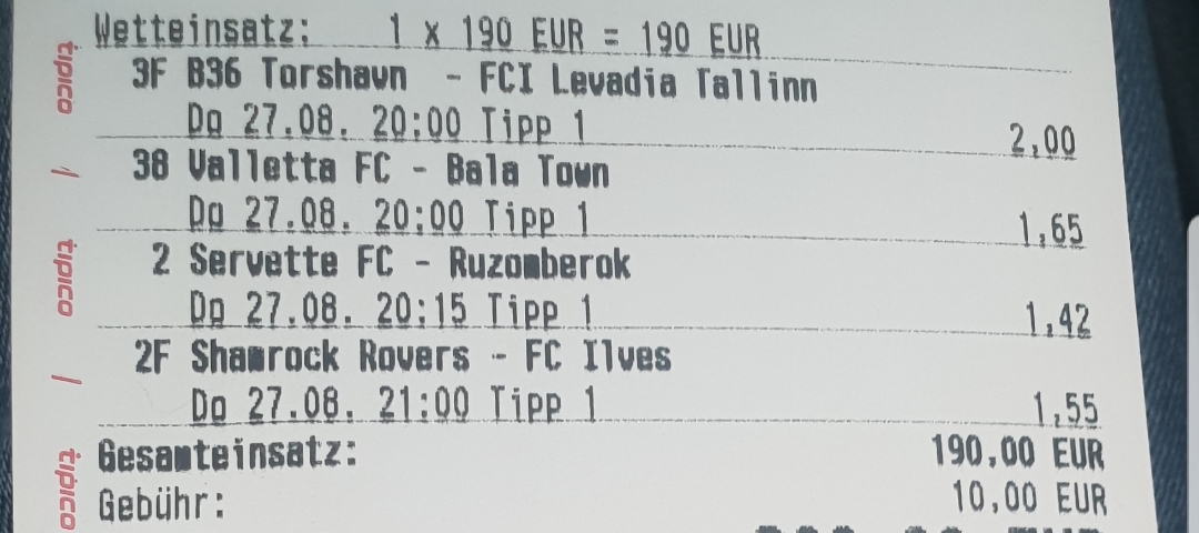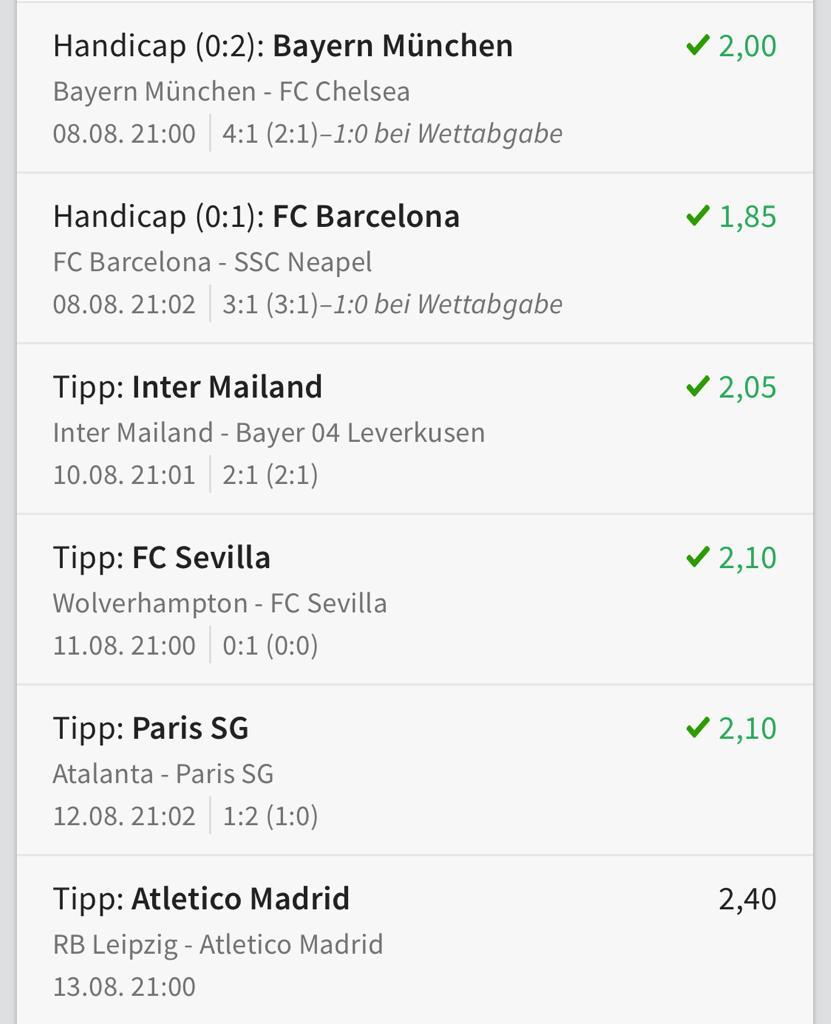 Bitte Regeln bei der Veröffentlichung von Wettscheinen beachten :winke: Macamod hat da sicher wieder ein Auge zugedrückt