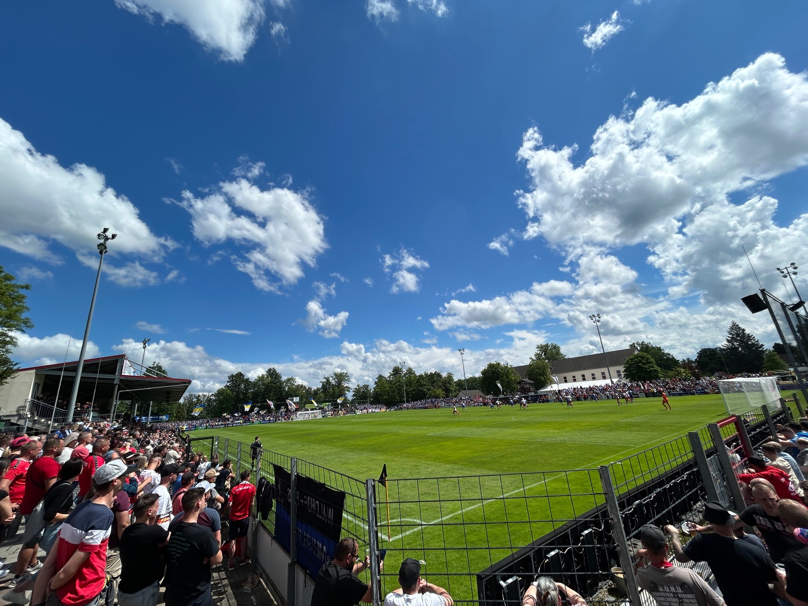 Tickets waren überdachte Steher im „Oberrang“ der Haupttribüne. Perfekt bei den sommerlichen Temperaturen, die Hütte war auch voll. Block war als Heimblock deklariert - die Verteilung aber eher so 50:50 und auch jede Menge scheußlicher Blau-Weiß-Gelber Fanartikel zu erblicken. Zu unserer Freude befand sich direkt hinter der letzten Reihe ein Kiosk, sodass man beim Anstehen nix vom Spiel verpasste. Die Preise mehr als fair: 0.4er Altenburger für 3€, Zitronenlimo für 2€. In der zweiten HZ holte Chris noch regionale Kost: Rostbrätel (war wohl so so la la) und zwei ordentliche Thüringer (leichte Abzüge für Born statt Bautzner Senf).