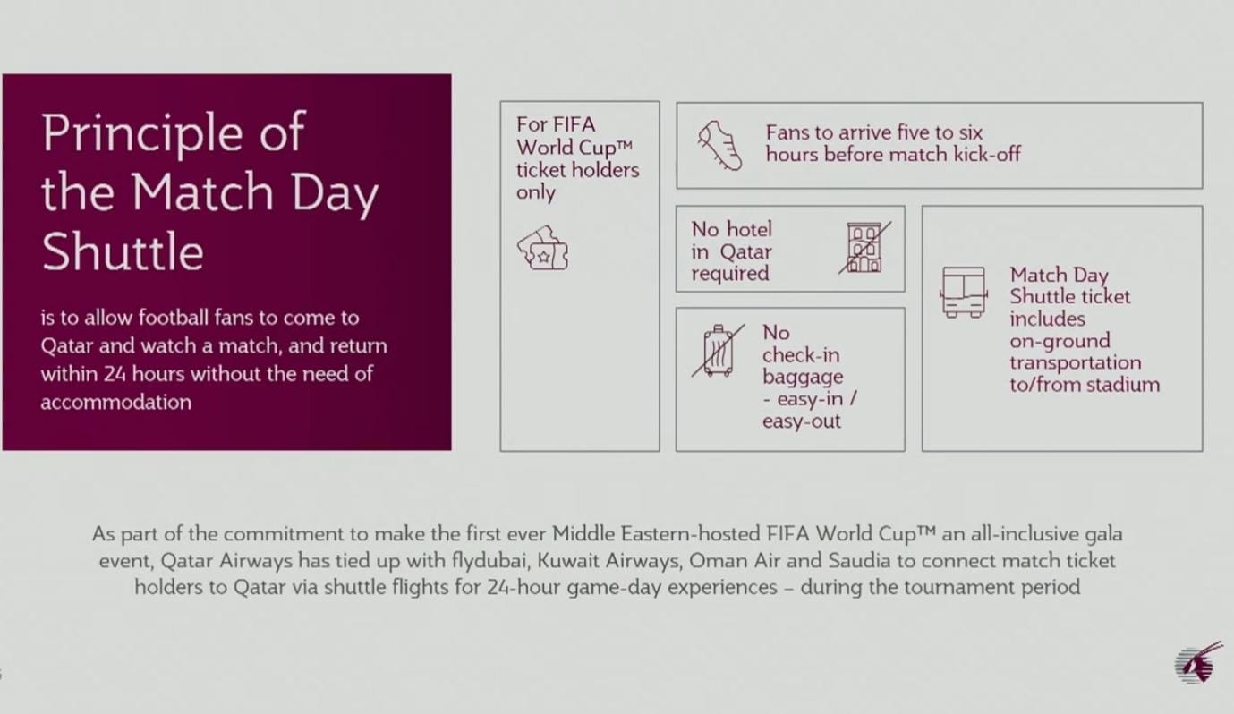 Al-Baker fügte hinzu: „Die Flüge werden täglich Tausende von Fans transportieren und sie am selben Tag in die Länder zurückbringen, aus denen sie abgereist sind.“Er fuhr fort: "Die Flüge werden die Unterkunftsmöglichkeiten für WM-Fans um Hotels in Nachbarländern erweitern."