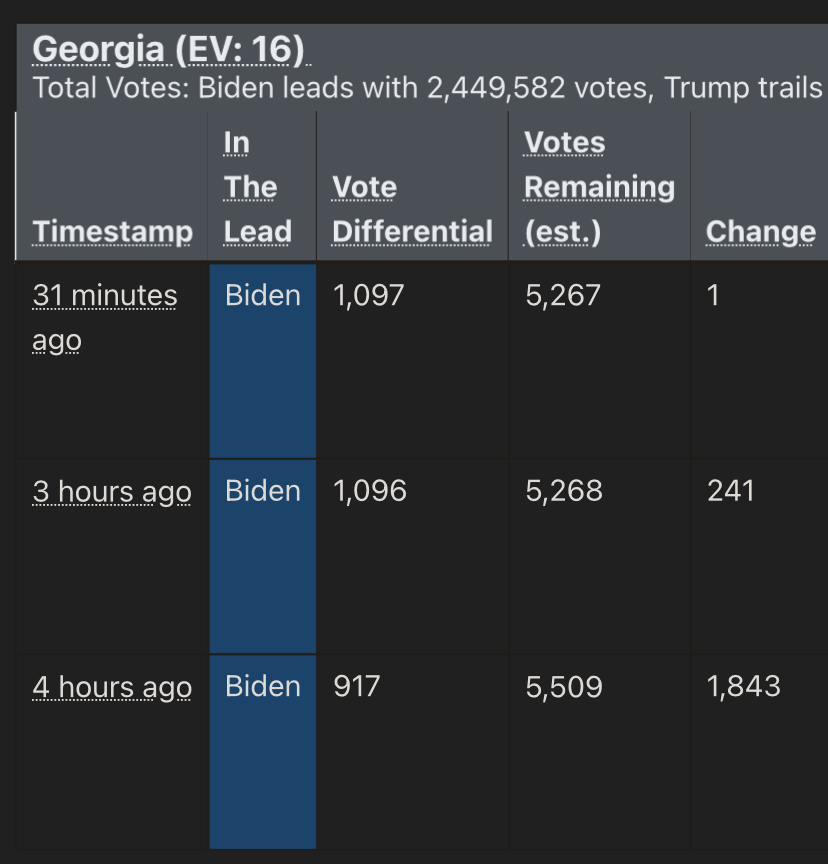 In Georgia sind wohl noch 200.000 Votes offen. Der Abstand ist ungefähr 100.000 Votes. Da müsste Biden dann ja schon 3/4 der verbleibenden Votes holen um zu gewinnen.