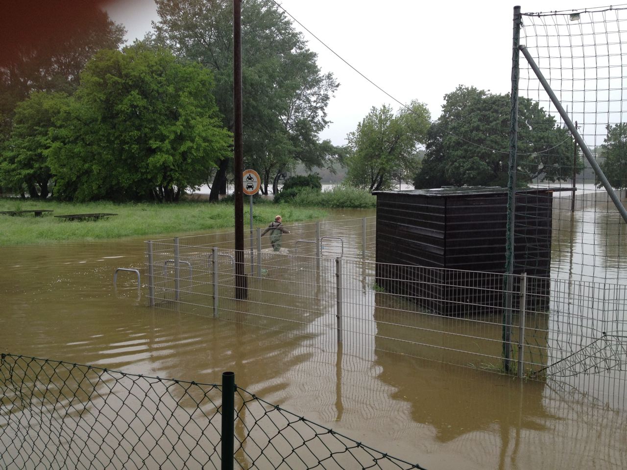 Trotz heldenhafter Abbauaktion der Zäune am Montag, wurde der Sportplatz wieder über 2 m geflutet.