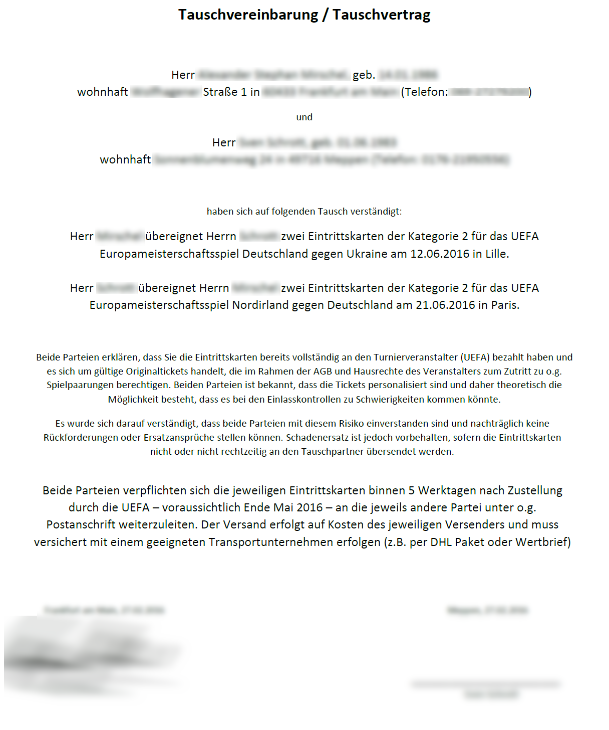 ich weiß nicht, ob es hier schon so etwas in der Art gibt. Jedenfalls mal anbei ein von mir genutzter "Tauschvertrag", den ich mit @FlinkeFlasche abgeschlossen habe. Mich würde einfach mal interessieren, ob es Anmerkungen gibt, was man weglassen kann, was unbedingt mit reinsollte etc